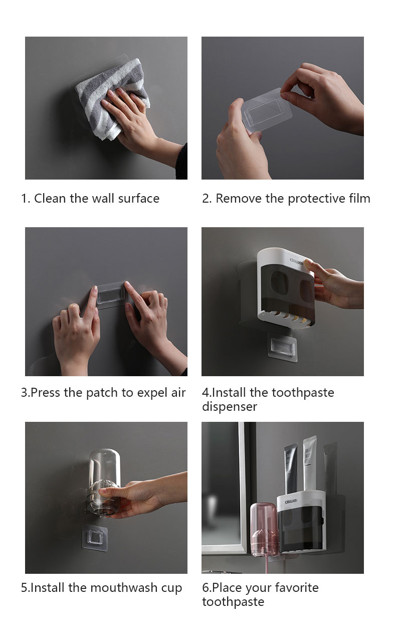Say goodbye to complicated setups with the Huamili Dual Toothpaste Dispenser’s no-drill installation. Using strong adhesive backing, it easily mounts onto smooth surfaces without damaging walls, making it perfect for rented spaces or those seeking damage-free installation.