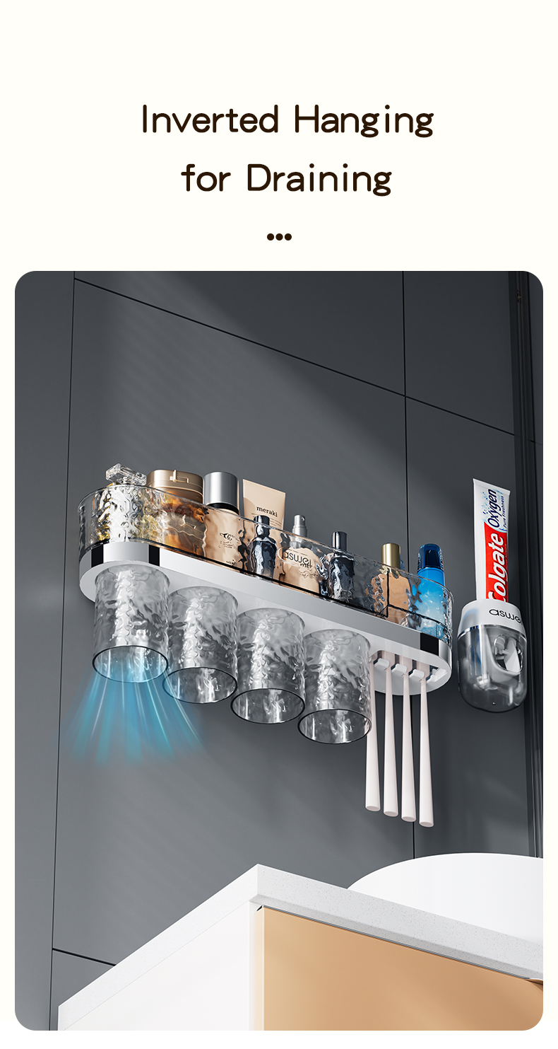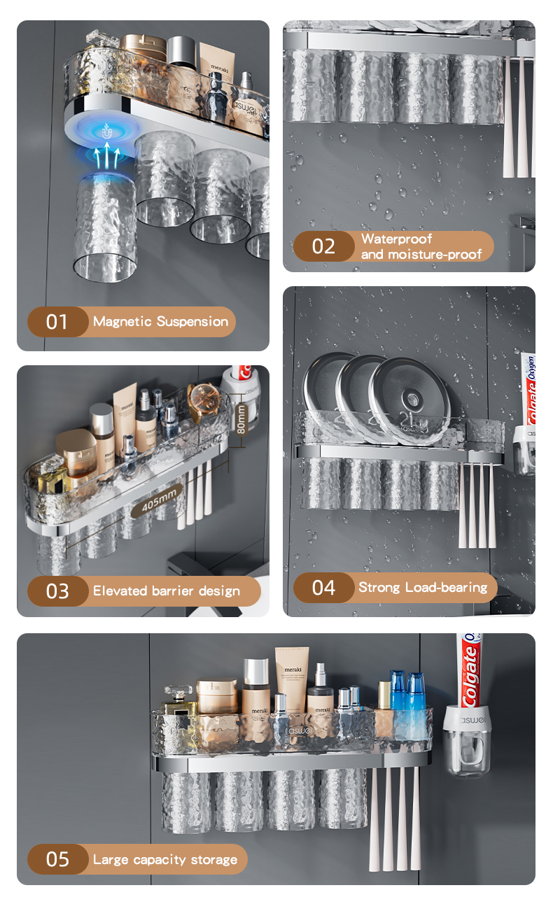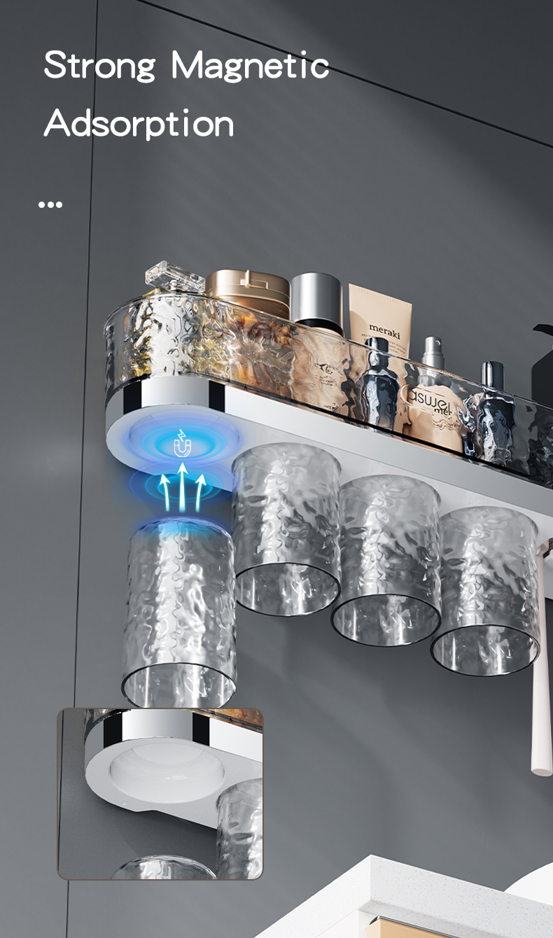 Each mouthwash cup is embedded with a hidden magnet that lets it float upside-down under the shelf, draining water away from dust and germs. The faceted glacier pattern catches the light like frosted crystal, adding a cool, modern accent to any bathroom palette.
