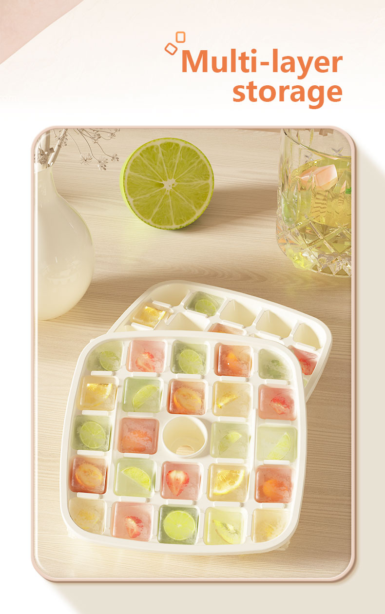 This double-layered storage box is built to keep ice cubes separated and ready for use. The multi-layer construction provides extra storage capacity, allowing you to make, store, and organize ice cubes efficiently. The upper layer acts as an easy-release tray, while the lower layer keeps the cubes fresh and easily accessible.